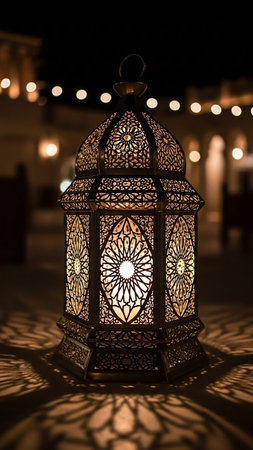 Lantern showing an ornate, antique-style metal lantern with intricate geometric patterns is illuminated from within, casting decorative shadows on a dark surface,...