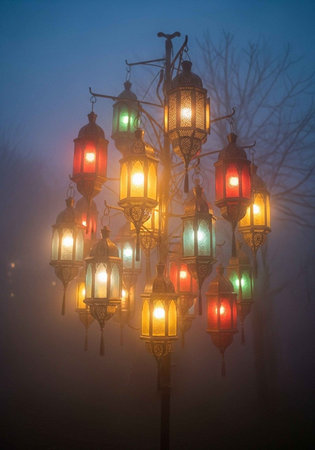 Multiple ornate lanterns with red, green, and yellow lights glowing through dense fog at night.