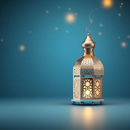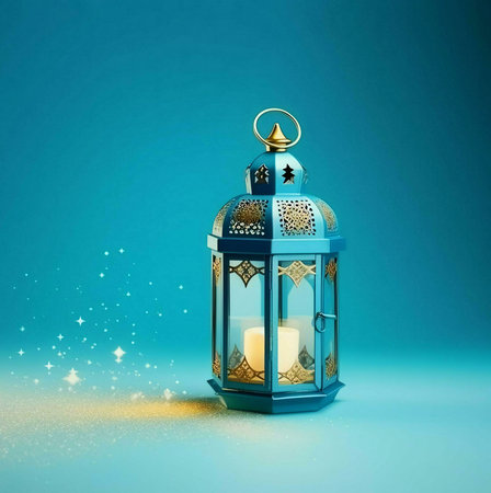 A beautiful blue lantern with intricate designs and a warm glow against a dark blue background. This image captures the spirit of Ramadan and Islamic culture.