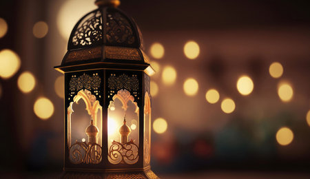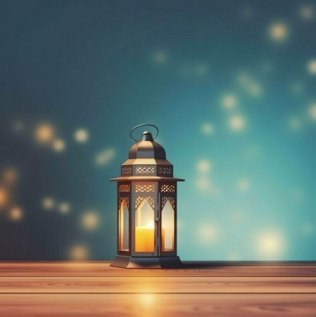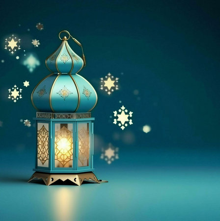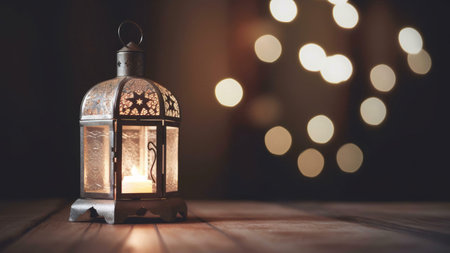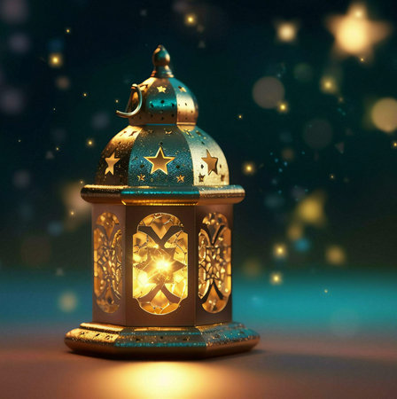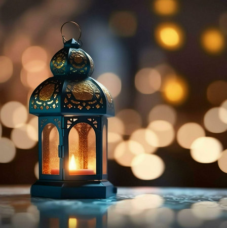 An ornate lantern with a lit candle inside. It's a beautiful symbol of hope and light, perfect for the holy month of Ramadan or Eid al-Fitr.