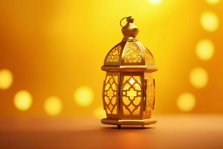 A golden lantern with intricate designs stands against a yellow bokeh background, symbolizing the warmth and spirituality of Ramadan.