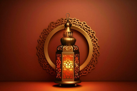 A golden Ramadan lantern sits on a red background, illuminating the scene with its warm glow. The lantern is intricately designed with traditional Islamic patterns and motifs, creating a sense of beauty and spirituality.