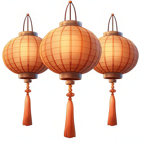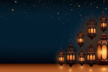 Two golden lanterns with intricate designs hang against a warm, orange background, with scattered star-like shapes, creating a festive atmosphere.