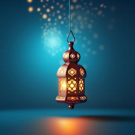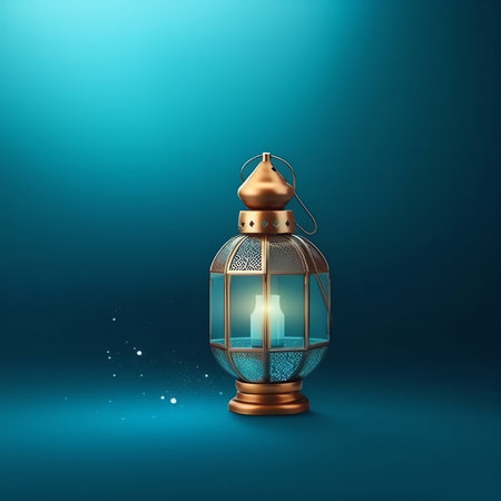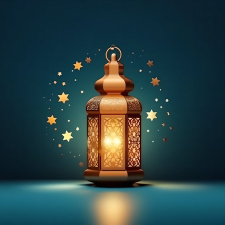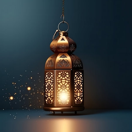 A golden lantern with a lit candle inside, representing the spirit of Ramadan.