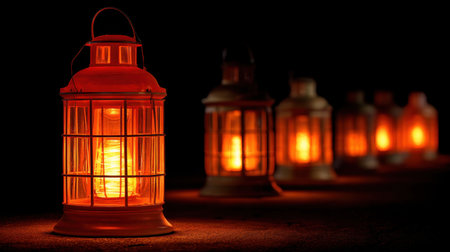 Vintage lanterns illuminate dark setting, casting warm orange glow. soft light creates cozy atmosphere, enhancing charm of rustic design