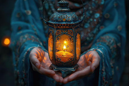 Arabic lantern with candle at night for Islamic holiday. Muslim holy month Ramadan. The end of Eid and Happy New Year. Copy space on dark background.
