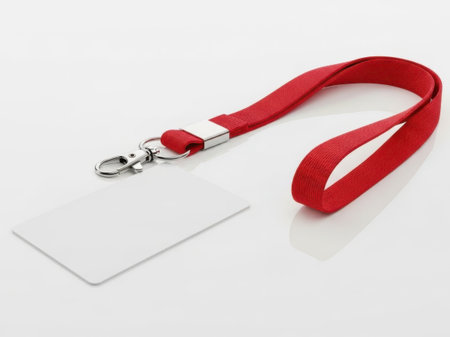 A bright red lanyard with a silver clip attached to a blank white card, ideal for identification or access control.