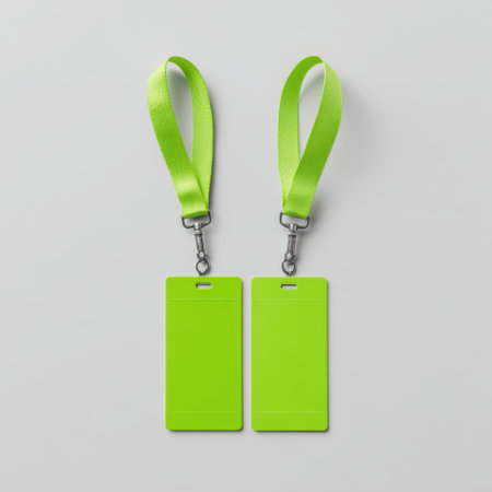 A pair of bright green lanyards with blank ID card holders ideal for conferences and events. Perfect for easy visibility and organization during activities.