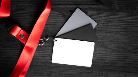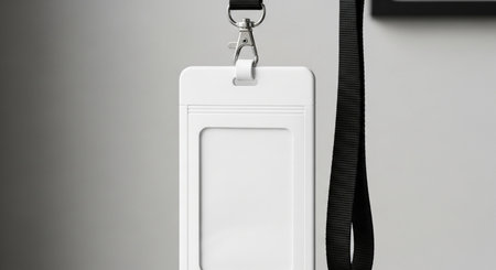Blank white ID badge with grey lanyard. Perfect for showcasing your company logo or event information.