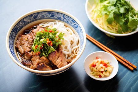 A vibrant bowl featuring Asian noodle soup with tender sliced pork, fresh herbs, and crispy toppings, showcasing a delightful meal experience perfect for any occasion.