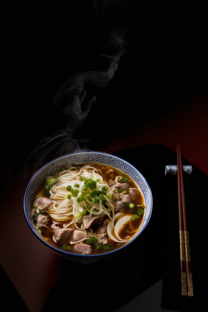 Steaming Bowl of Noodle Soup with Scallions and Chopsticks on Black Background