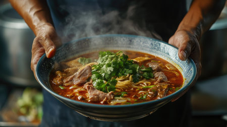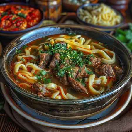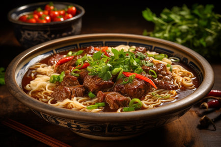 Lagman or Laghman, Traditional Thick Warming Beef Soup is Popular in Uzbekistan and Kazakhstan, Central Asian Dish of Pulled Homemade Noodles, Generative AI Illustration