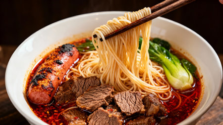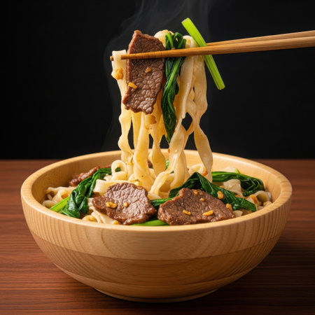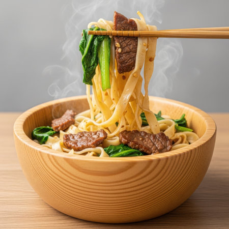 A close-up shot of a wooden bowl filled with hearty beef noodle soup, with chopsticks lifting a generous portion of noodles and meat.