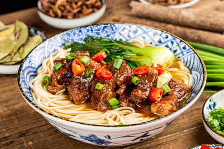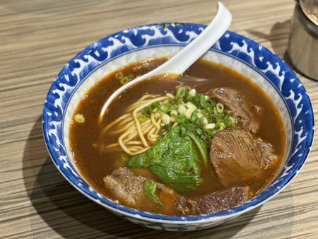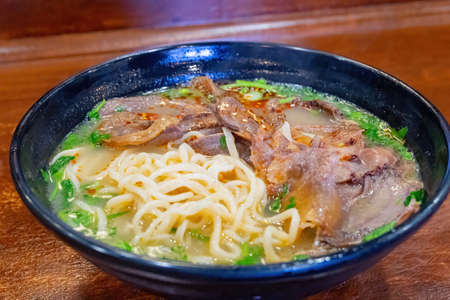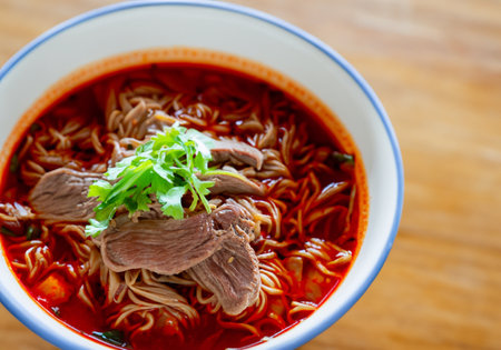 Beef noodle ramen meal with tomato sauce broth in bowl on bright wooden table, famous chinese style food in Taiwan, close up, top view, copy space