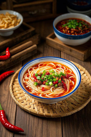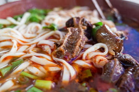 Bowl of hot spicy noodle soup with pork and vegetables on the street food stall.