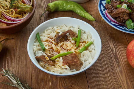 Guriltai Shul - Mongolian Noodle Soup , Mongolian cuisine, Asia Traditional assorted dishes, Top view.