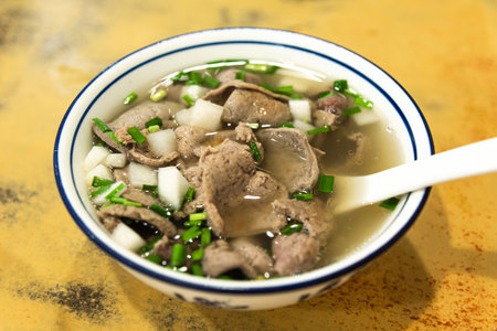 Close up shot of a bowl of Lanzhou beef noodle soup, ate at Las Vegas, Nevada