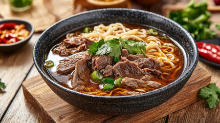 Chinese noodle soup with beef and vegetables in bowl on wooden tablee