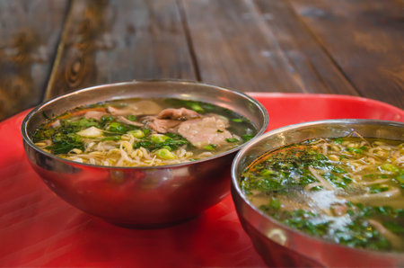 Two cups of Vietnamese pho bo soup on table in cafe, noodle soup with beef, herbs and soy sprouts