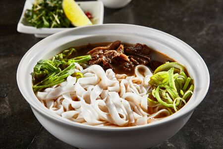 Vietnamese soup Fa Bo on a plate with beef and rice noodles is the unsurpassed taste of it eaten with chopsticks