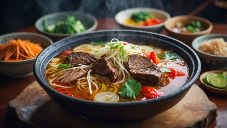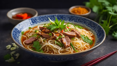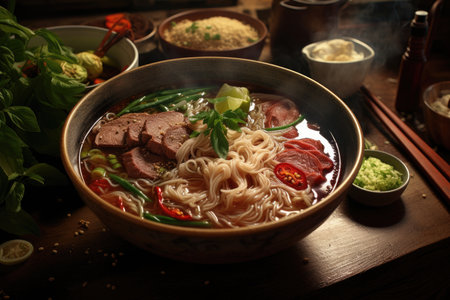 Steamed bowl of Vietnamese pho with beef and herbs...