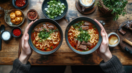 Two people enjoying a delicious beef noodle soup with chopsticks, shot from above on a rustic wooden table