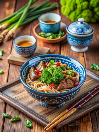 Close-up shows a delicious beef noodle bowl with vegetables, garnished with greens, perfect for showcasing Asian cuisine and healthy eating.