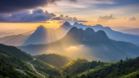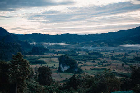 Scenic view of misty mountain in rain season at Doi Pha Hee, Chiang Rai, Thailand.