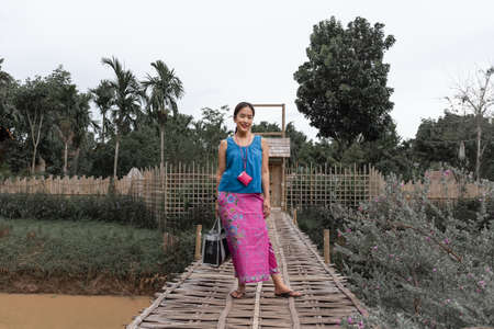 Beautiful Thai woman wearing old Thai traditional cloth standing on bamboo bridge.
