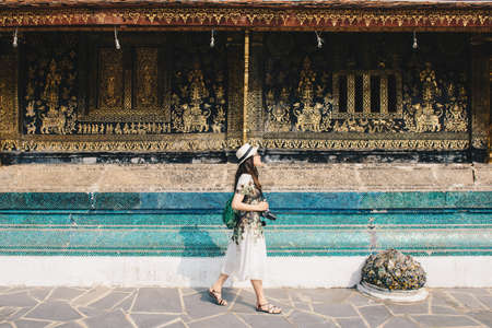 Portrait of young Asian tourist visiting Wat Xieng Thong an iconic temple in Luang Prabang, town in north central of Laos. Conceptual of tourist enjoying vacation and holiday