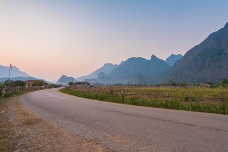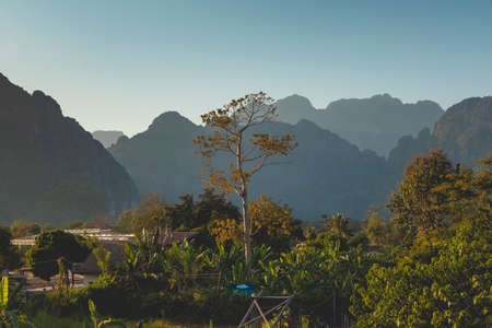 Village and mountain in Vang Vieng, Laos Southeast Asia.