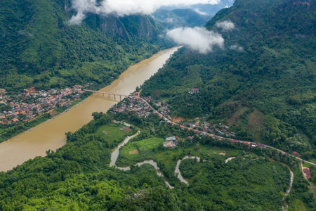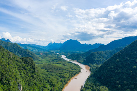 Aerial view of mountains and river Nong Khiaw. North Laos. Southeast Asia. Photo made by drone from above. Bird eye view.