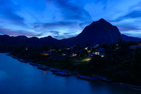 Evening twilight settles over Nong Khiaw, Laos, with village lights glowing beside the Nam Ou river and a dramatic limestone mountain rising in the background. Traditional wooden boats line the tranquil riverbank beneath a vivid blue sky.