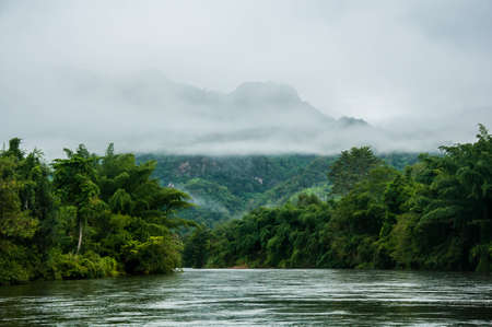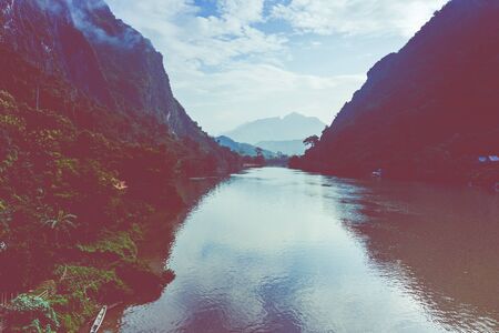 Landscape image of river with mountains and clouds background, Vang Vieng, Loas
