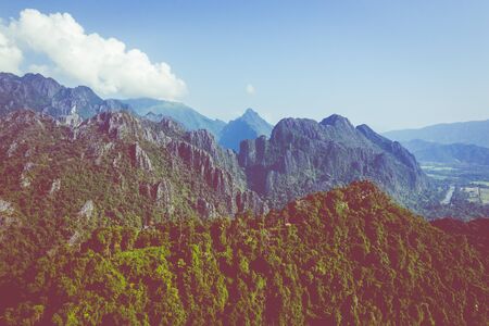 Vang Vieng, Laos - December 09, 2019: Landscape of karst mountains, from the city of Vang Vieng, Laos, covered with forests formed by lush green tropical trees. Vientiane province.