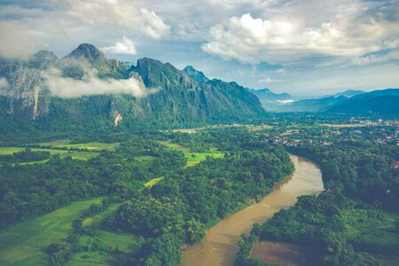 Aerial view of beautiful landscapes at Vang Vieng , Laos. Southeast Asia. Photo made by drone from above. Bird eye view.