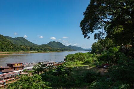Traditional Long Boat on the Mekong River and mountains view in Luang Prabang, Laos.