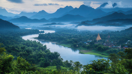 Broad view of the Mekong River flowing beside lush green hills and the town of Luang Prabang, Laos. Blue sky with scattered clouds stretches above forested mountains, creating a serene tropical landscape.