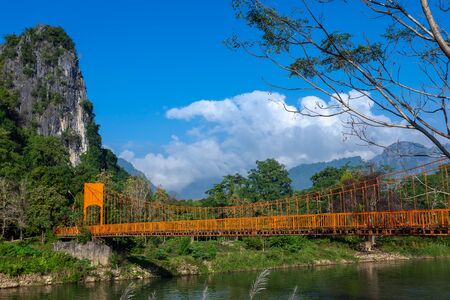 Landcape of muontain in vangvien Laos with long orange bridge and The beautiful mountains rang as a backdrop