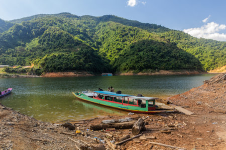 NAM OU, LAOS - NOVEMBER 23, 2019: Boats at Nam Ou 5 reservoir, Laos