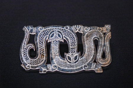 Buddhist metal bracelet on a black background close-up.