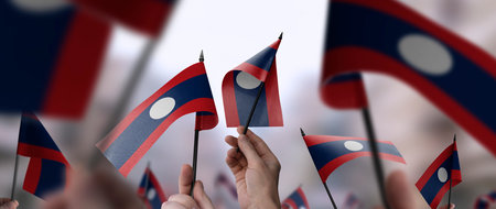 Laos flags in their hands on a blurred urban background