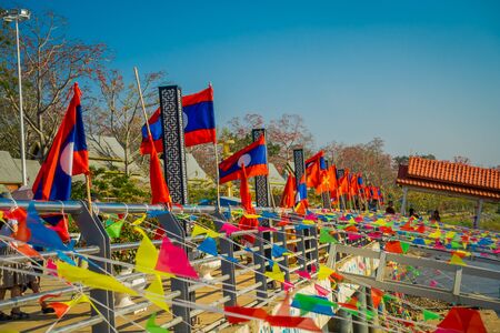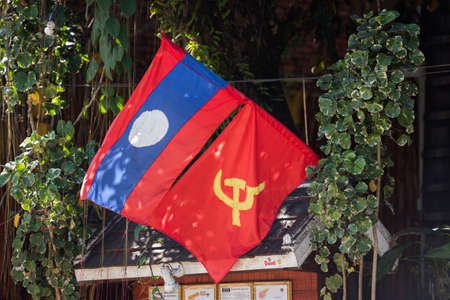 LOUANGPHABANG, LAOS - JANUARY 11, 2017: Flags on the facade of a building. Close-up