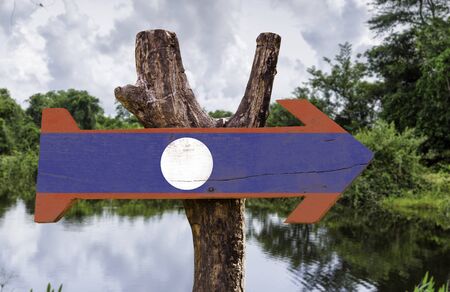 Laos flag wooden sign board in wetland background
