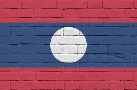 Laos flag depicted in paint colors on old brick wall close up. Textured banner on big brick wall masonry background