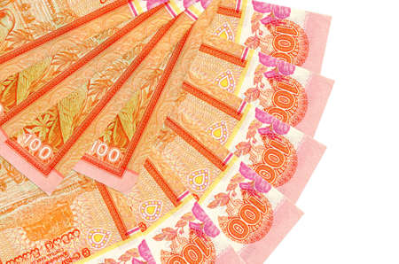 100 Sri Lankan rupees bills lies isolated on white background with copy space stacked in fan shape close up. Financial transactions concept