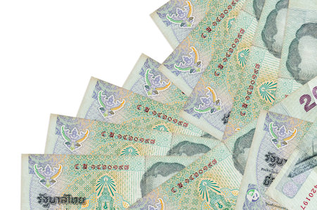 20 Thai Baht bills lies isolated on white background with copy space stacked in fan shape close up. Financial transactions concept