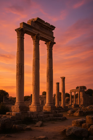 Ancient columns stand majestically as the sun sets, casting a warm glow over the ruins