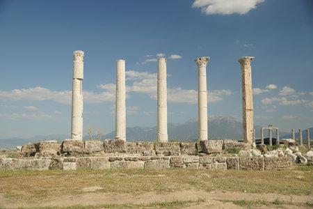 View of historical ancient city of Laodicea in Denizli with high columns on bright blue sky background.