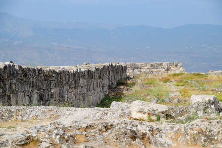 The walls of the ancient ruins of limestone blocks. Ruins of the city of Hierapolis, Turkey.
